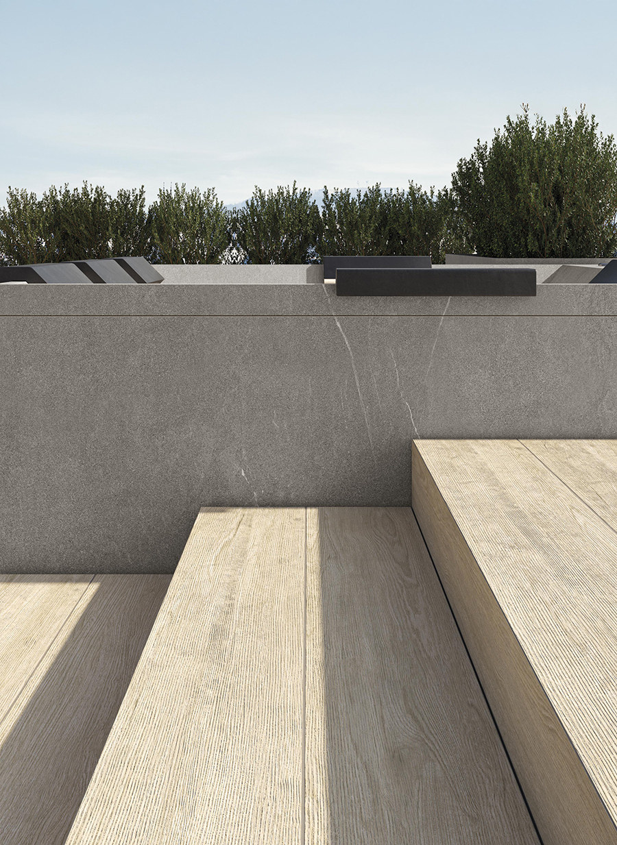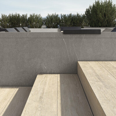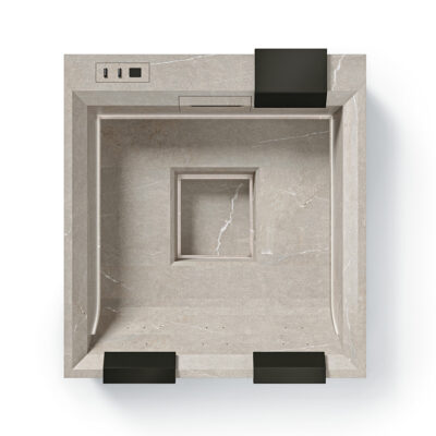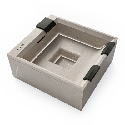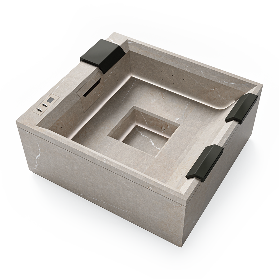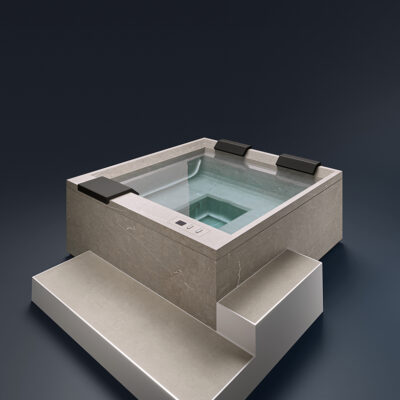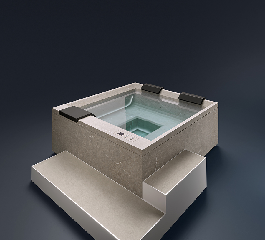 Rock s’intègre parfaitement au paysage, ressemblant à une piscine naturelle émergeant de la roche. Sa finition raffinée en grès cérame, riche en veinures, renforce l’impression d’un élément naturel. Rock est conçu pour accueillir jusqu’à 5 personnes.